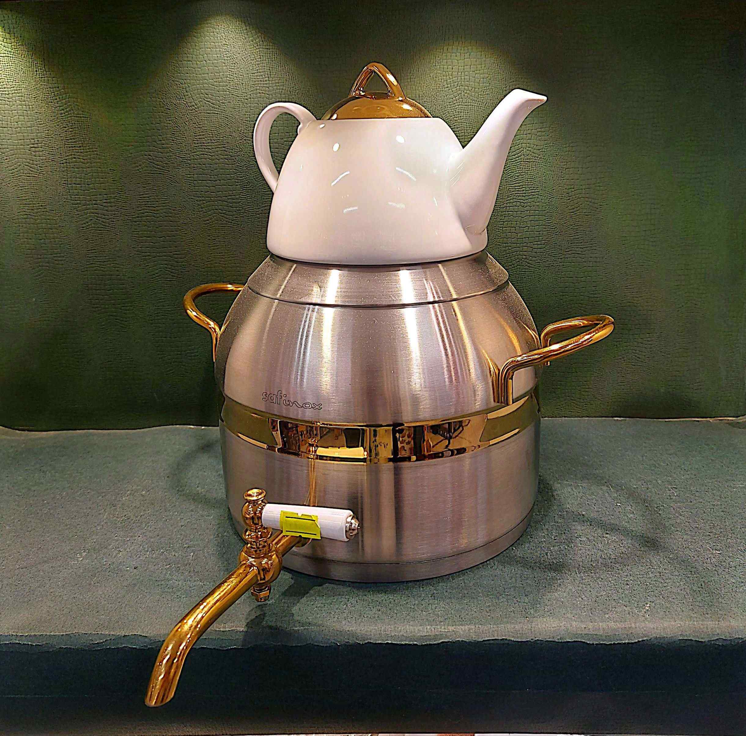کتری شیر دار استیل دسته طلایی با قوری چینی از برند سافینوکس۴٬۵۶۰٬۰۰۰ تومان