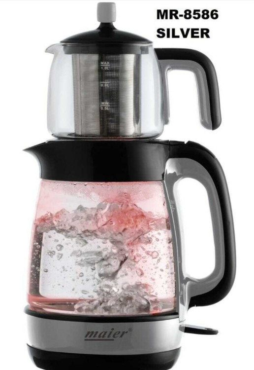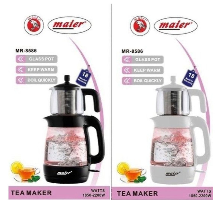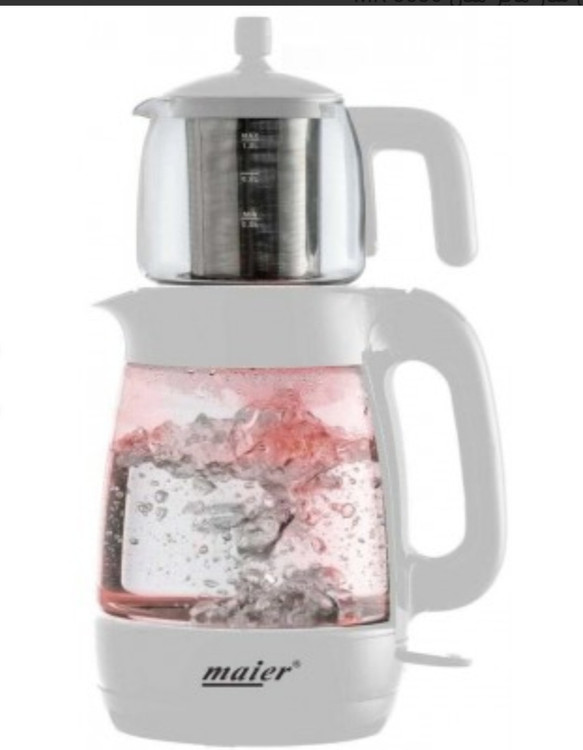 چای ساز مایر در سه رنگ سفید و مشکی و سیلور با توان مصرفی ۲۲۰۰و قوری و کتری پیرکس که حجم قوری ۱ لیتر و حجم کتری ۳ لیتر