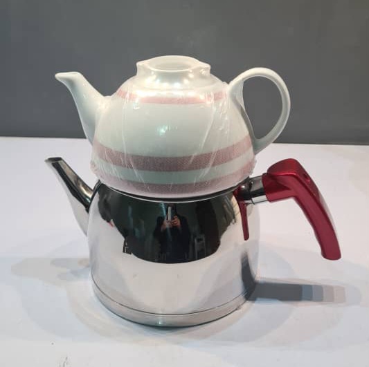 کتری استیل با دسته زرشکی و صورتی و قوری چینی