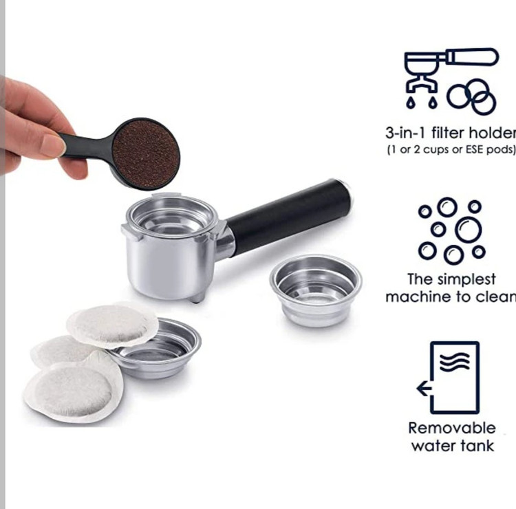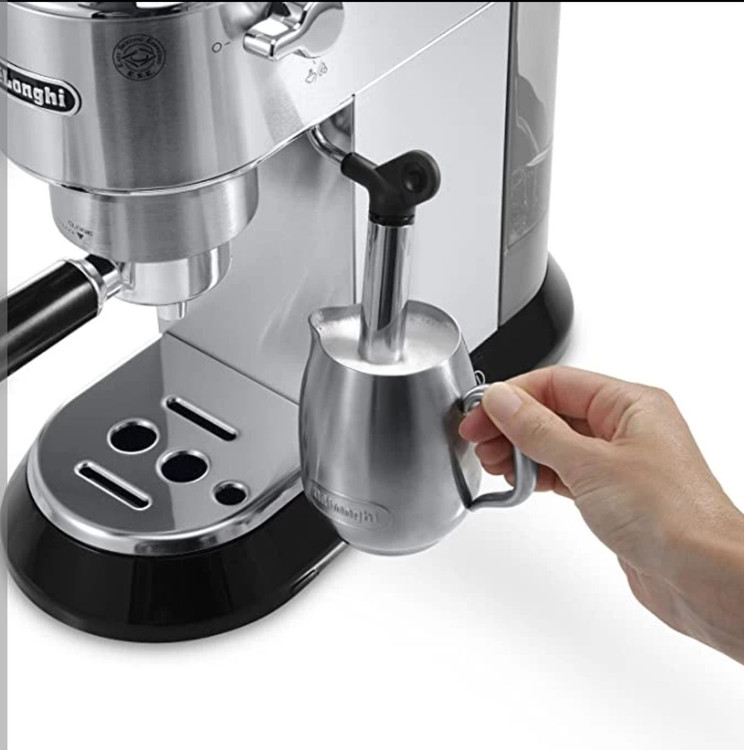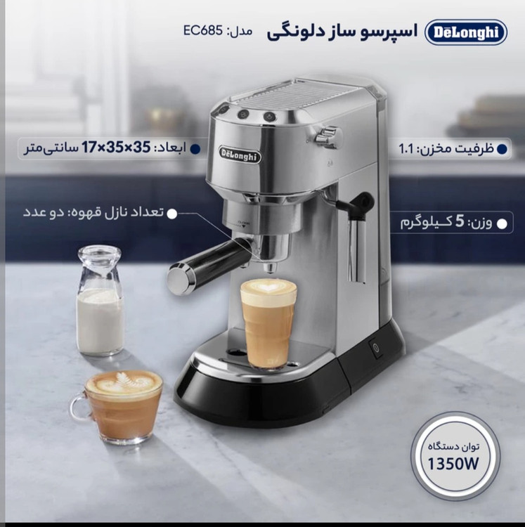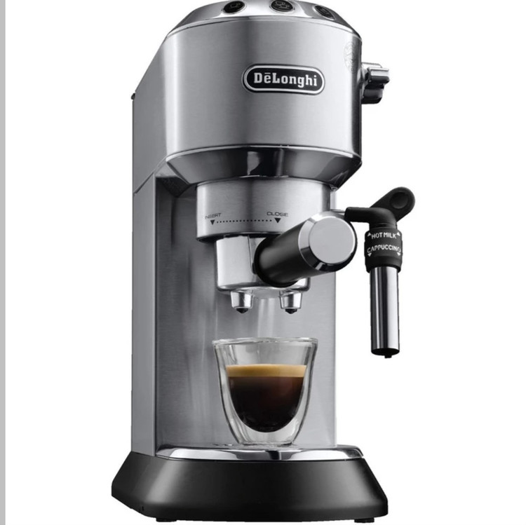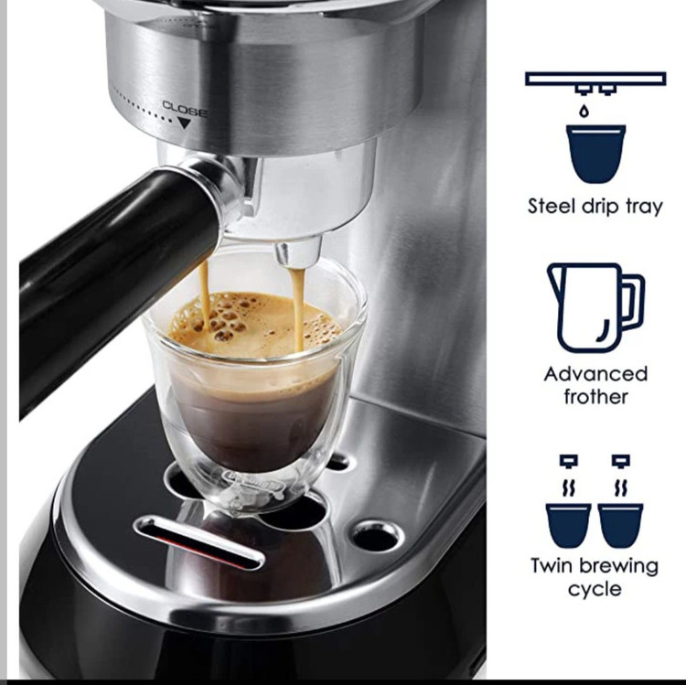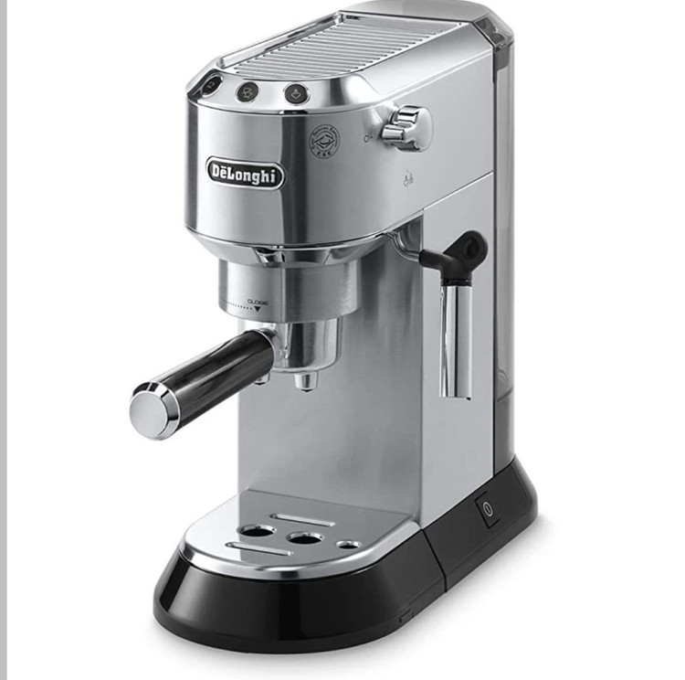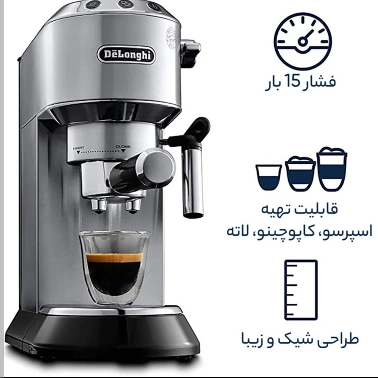 اسپزسو ساز دلونگی با بدنه استیل ضد زنگ و روکش براق فلزی زیبایی خاصی دارد.مخزن اب ۱/۱لیتر و فشار بخار ۱۵ بار است .دارای سینی چکه گیر است.خاموشی خودکار دارد.با این دستگاه میتوانید علاوه بر اسپرسو .قهوه با کرمی یکدست و صاف .کاپوچینو.ماکیاتو.کافه لاته را با سیستمی چرخشی و قابل تنظیم دم کنید .نوشیدنی قابل تهیه اسپرسو .کافه لاته و کاپوچینو است.
