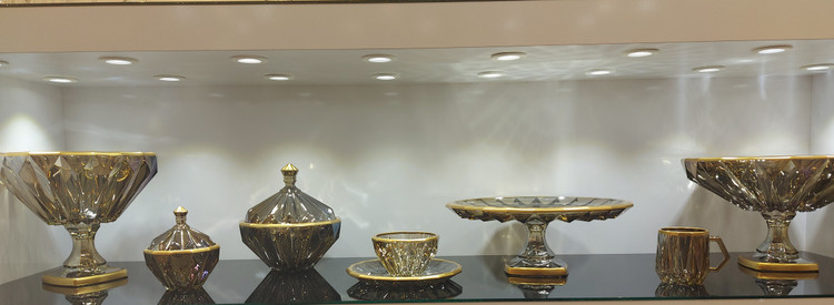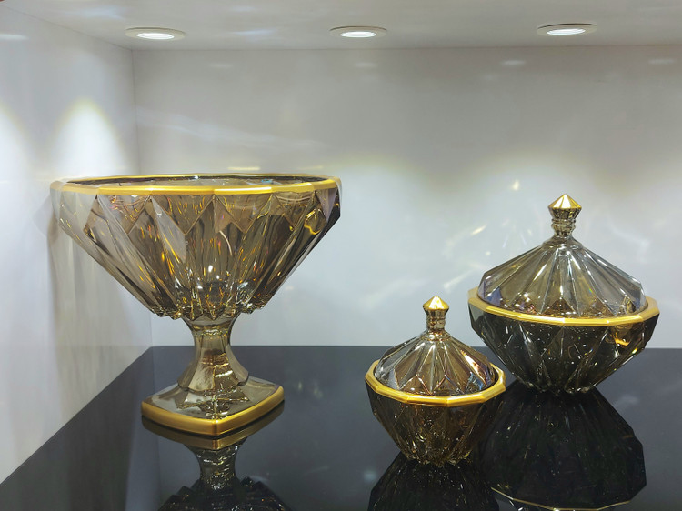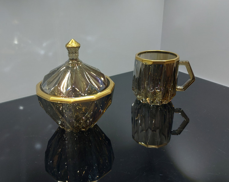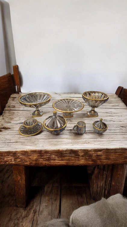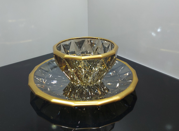 سرویس بلور ۲۵ پارچه شامل ۱ عدد میوه خوری +۱ عدد شیرینی خوری +۱ عدد ظرف آجیل +۶ عدد پیشدستی و ۶ عدد پیاله و ۶ فنجان و ۱ عدد قندان و ۱ عدد شکلات خوری میباشد .رنگ شامپاینی با لبه طلایی به سبک کلاسیک و قالب گرد از جنس بلور شفاف و ساخت کارخانه ی نوری تازه میباشد.