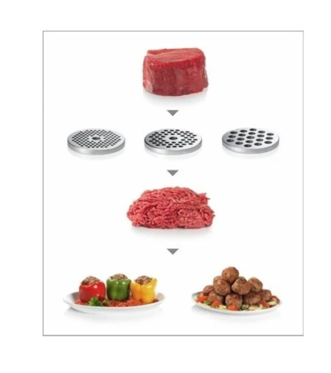 چرخ گوشت بوش مدل MFW68660 با توان ۲۲۰۰ وات دستگاهی قدرتمند است.جنس تیغه از فولاد ضد زنگ است.قیف مخصوص تهیه ی سوسیس دارد .طول سیم مناسب است و سینی فلزی دارد.دگمه ی روشن و خاموش دارد .عملکرد معکوس دارد.صفحات خروجی در پشت دستگاه در مکان مناسب قرار دارد .این مدل دارای قطعات مخصوص رنده کردن و سوسیس ساز و همچنین آبگیری برخی میوه را دارد .