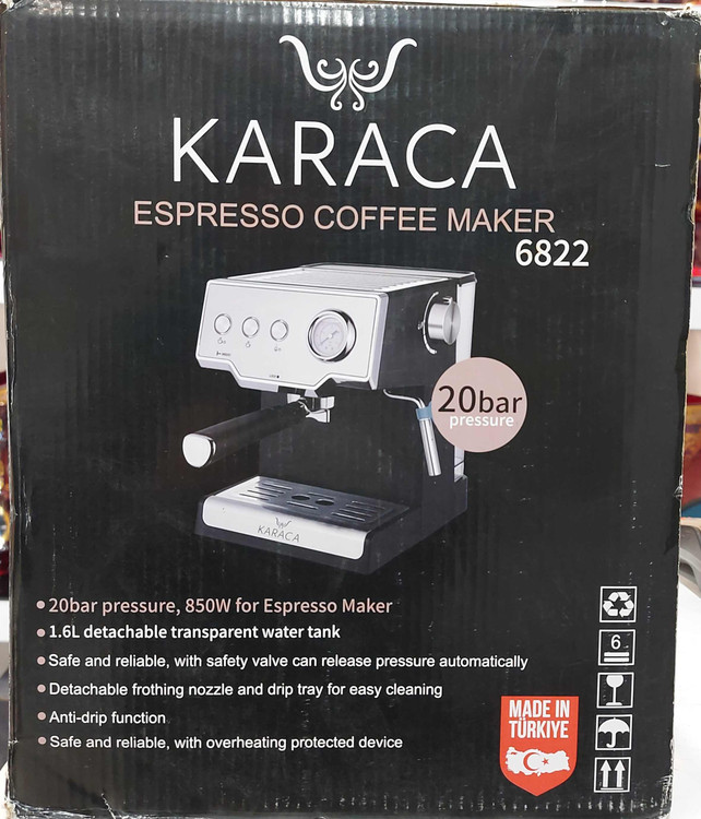 اسپرسو ساز کاراجا مدل ۶۸۲۲ دارای ۸۵۰ وات و ۲۰ بار بخار میباشد.این اسپرسو ساز دارای نشانگر بخار است و نازل بخار برای فوم شیر و کاپوچینو دارد .مخزن آب این دستگاه ۱/۶لیتر است.