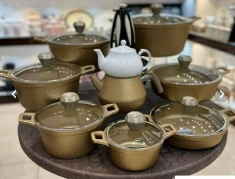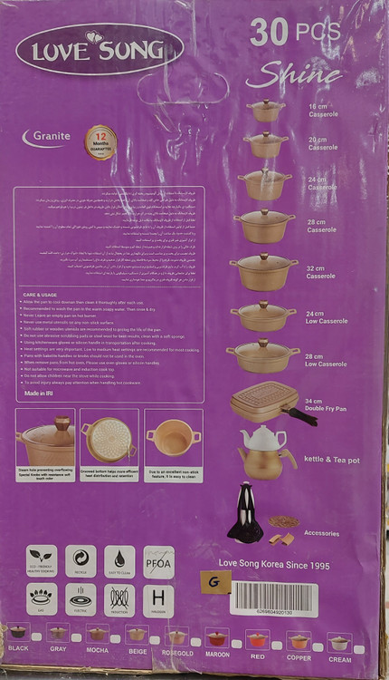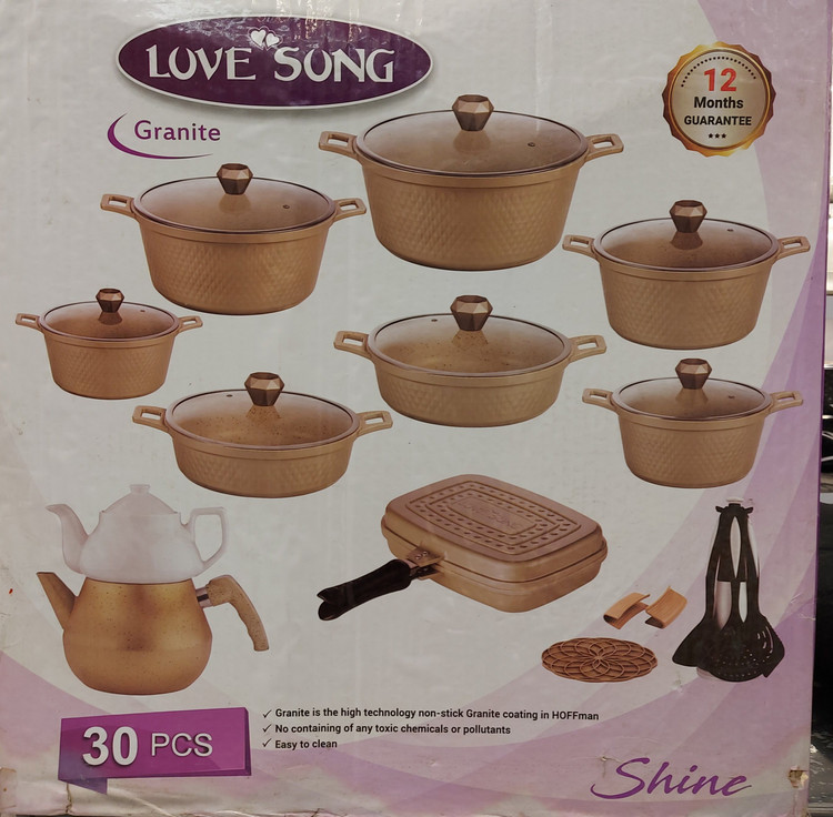 سرویس قابلمه ۳۰ پارچه شامل ۵ قابلمه در سایزهای مختلف.دو تابه مجزا در دو سایز. یک عدد تابه رژیمی . ست کفگیر و ملاقه نسوز به همراه استند . ست کتری و قوری .زیر قابلمه و دستگیره های نسوز .درب های نشکن به همراه سوپاپ اطمینان