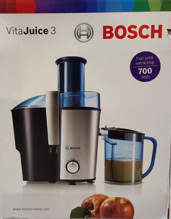 ابمیوه گیری بوش با قدرت ۷۰۰وات ودارای ۲ سرعت و کنترل چرخشی است .ظرفیت مخزن ۱/۲۵ لیتر و ظرفیت مخزن تفاله ۲ لیتر است.آسیاب و مخلوط کن ندارد.جنس تیغه استیل ضد زنگ و دارای سیستم ضد چکه میباشد .جنس بدنه استیل ضد زنگ است.
