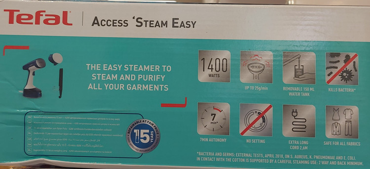 اتو بخار دستی تفال با توان ۱۴۰۰ وات با بخاردهی ۲۵ گرم در دقیقه که در ۲۵ ثانیه داغ میشود. پخش عمودی دارد .سیستم ضد چکه و رسوب زدایی دارد.قابلیت کنترل دما و مخزن رسوب ندارد.قابلیت تولید بخار با فشردن دکمه بخار دارد.مناسب تمام پارچه ها است.جنس سری بخار از پلاستیک است.۸ دقیقه کارکرد بدون وقفه دارد