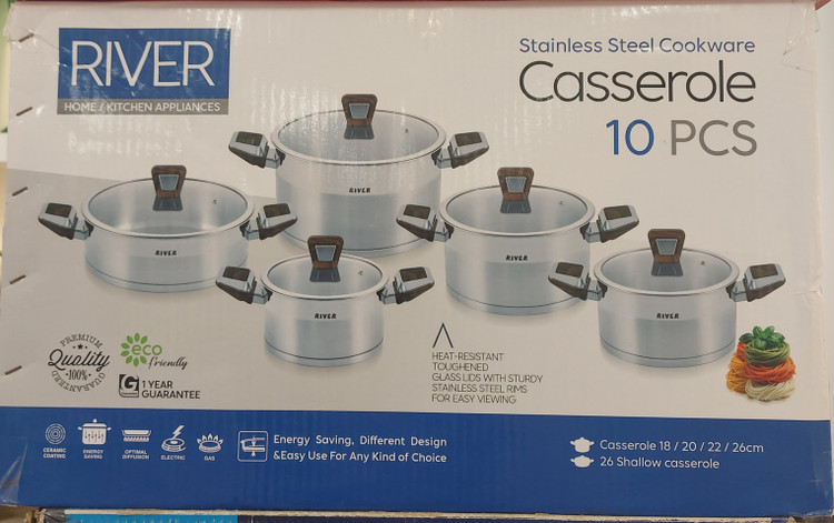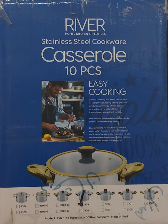 سرویس قابلمه ۱۰ پارچه ریور کد ۳۳۰۳ از جنس استیل ۱۸/۱۰ نیکل کروم است.دستگیره و قپه های ترکیبی از استیل و طرح سیلیکون دارد.ضخامت ورقه ی استیل ۱ میل قالب سنگین است.قابلمه و تابه از جنس استیل و درب ها از جنس پیرکس مقاوم است.قابلمه ها شامل قابلمه ۱۸ و ۲۰ و ۲۲ و ۲۶ و تابه دو دسته سایز ۲۶ است.