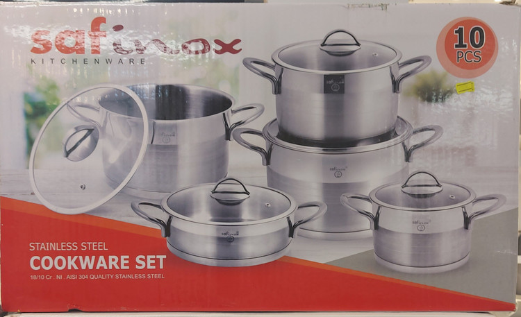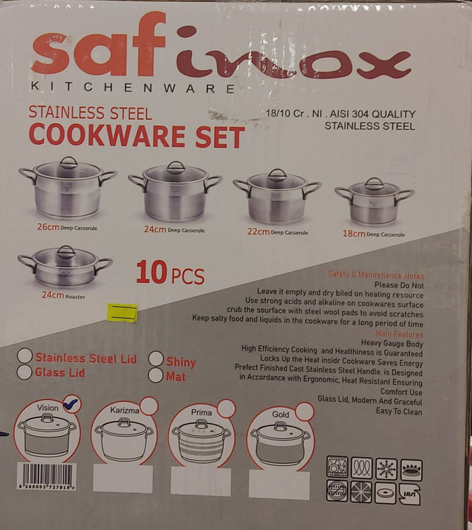 سرویس ۱۰ پارچه استیل از برند سافینوکس با بدنه از جنس استیل و درب پیرکس و دستگیره ی تمام فلزی که دارای سوپاپ خروج هوا میباشد .کف چدنی برای جلوگیری از سوختگی غذا و پخش حرارت یکسان به کف قابلمه دارد .قابلمه ها در سایز های ۱۸ و ۲۰ و ۲۴ و ۲۶و یک عدد تابه تک دسته ی بزرگ ۲۴ دارد .