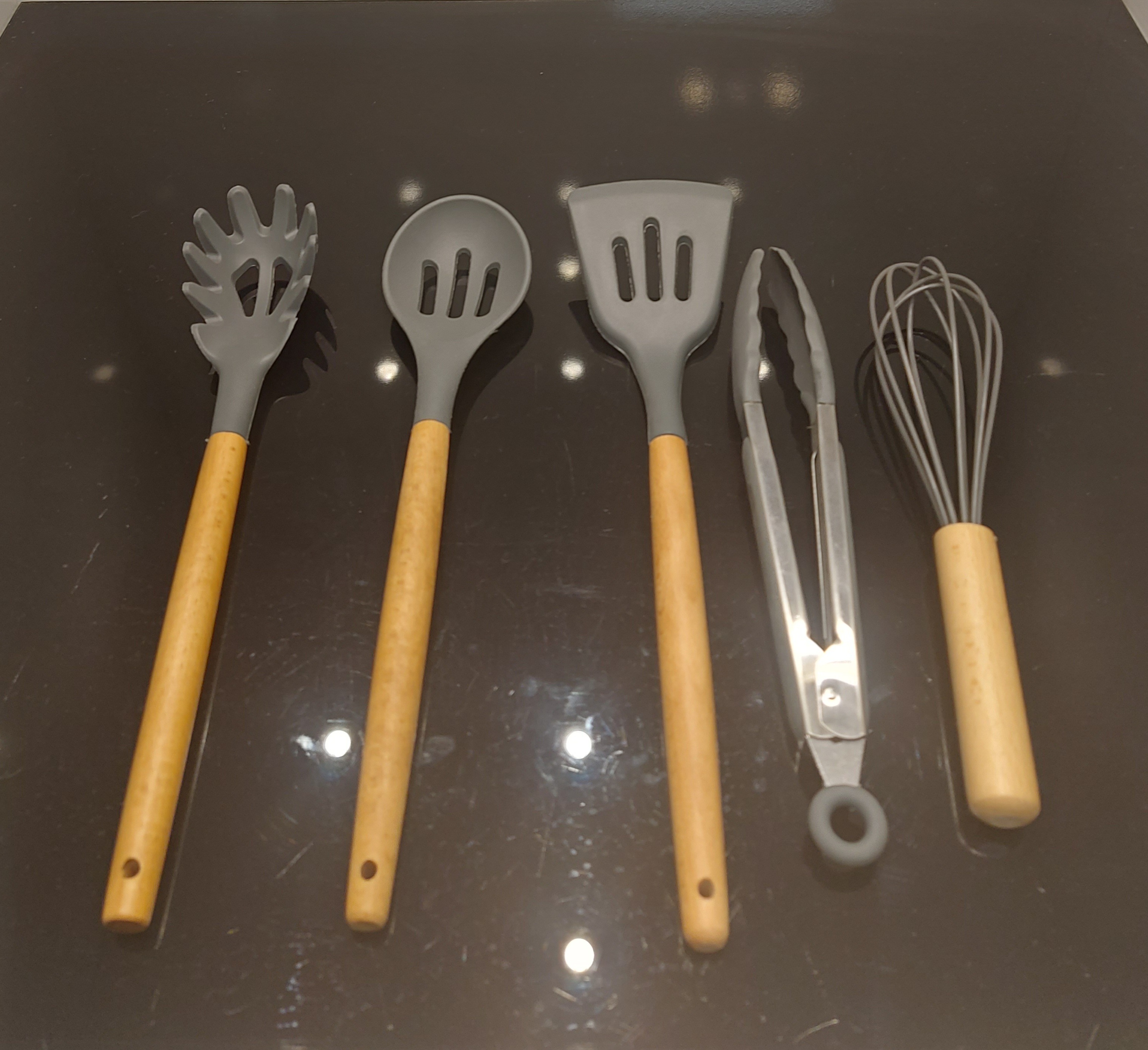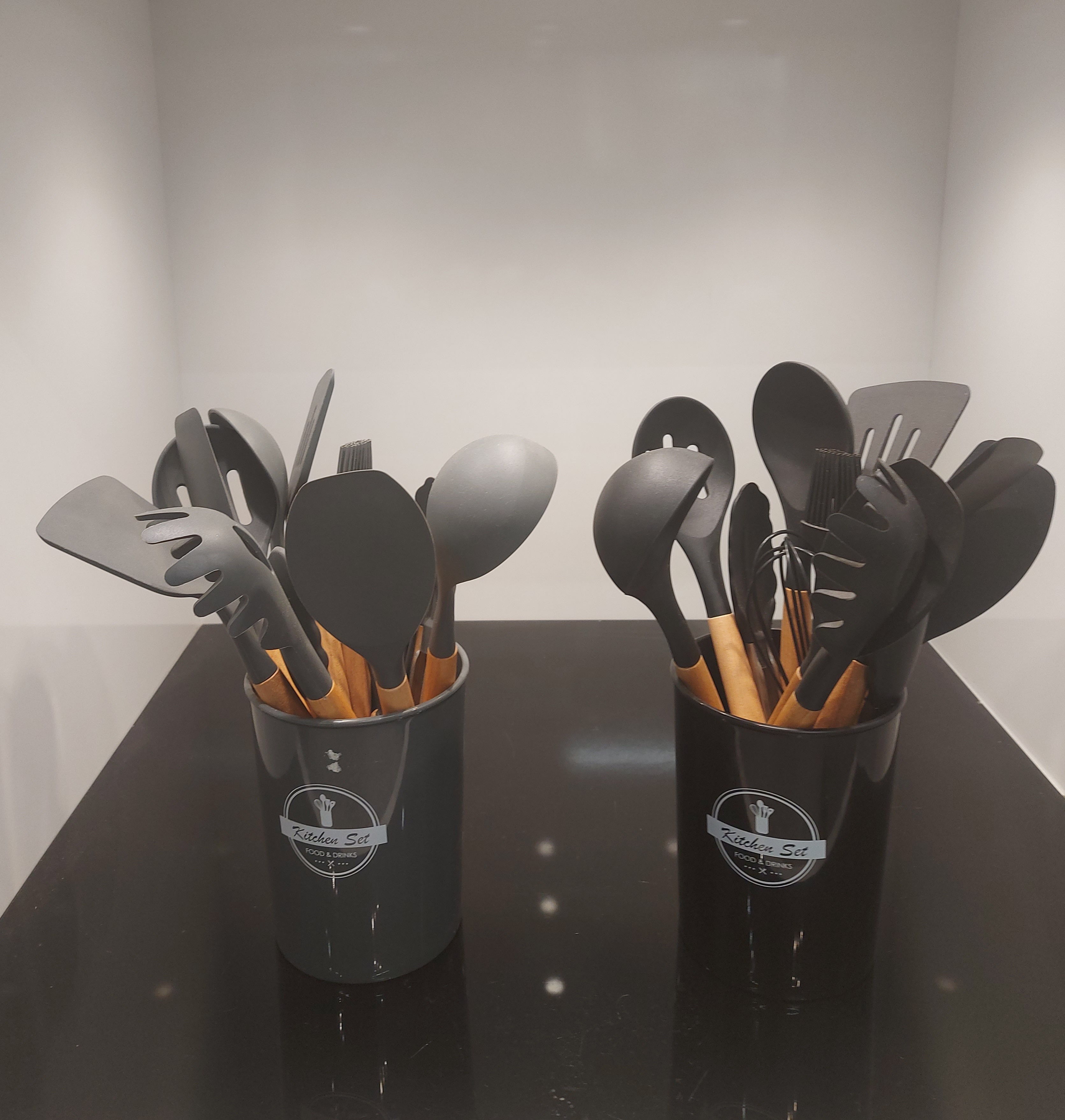 ست کفگیر و ملاقه سیلیکونی سطل دار از جنس در جه یک دارای سطل فلزی که از جنس مرغوب است.این سرویس در برابر حرارت مقاوم است و ضد خش میباشد.دو رنگ پر فروش مشکی و طوسی دارد