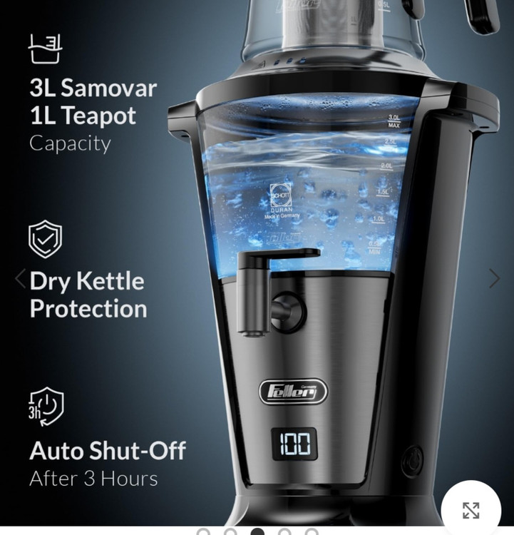 سماور فلر با توان ۲۰۰۰ واتو ظرفیت ۳ لیتر که جنس قوری از پیرکس است.المنت حرارتی مخفی دارد.بدنه سماور از استیل و پلاستیک که قابلیت گرم نگهدارنده دارد.فیلتر استیل ضد زنگ دارد.پایه ضد لغزش دارد.سینی چکه ریز و صافی توری داخل قوری دارد.