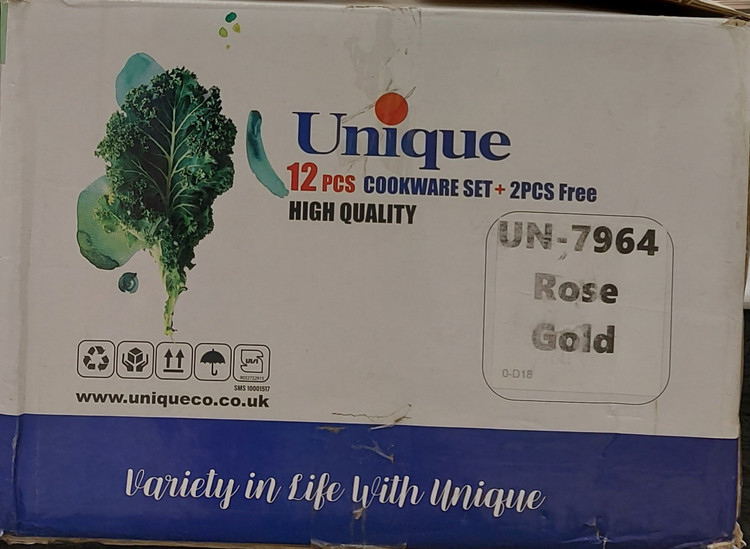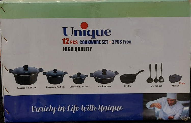 سرویس ۱۲ پارچه یونیک مدل ۷۹۶۴از جنس گرانیت با رنگرزگلد شامل ۳ عدد قابلمه در سایزهای ۲۸ و ۲۴و ۲۰ ویک تابه دو دسته و یک عدد تابه تک دسته میباشد .این سرویس یک ست کفگیر و ملاقه