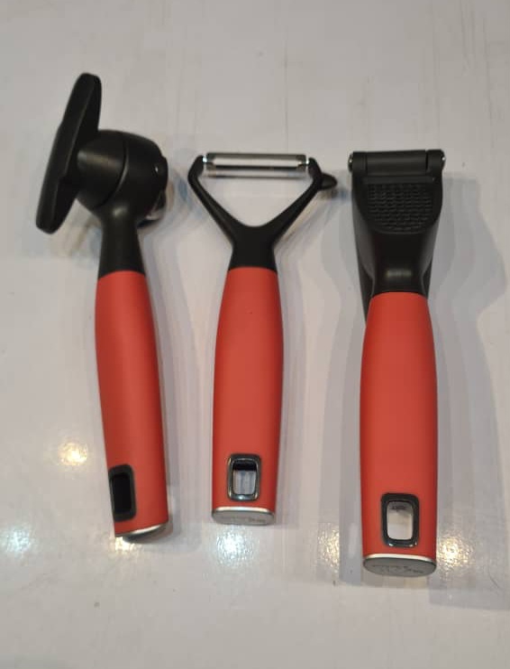 ست ابزار آشپزخانه شامل کفگیر و ملاقه و دربازکن به همراه سیر خرد کن و پوست کن.با استند مشکی و دسته قرمز