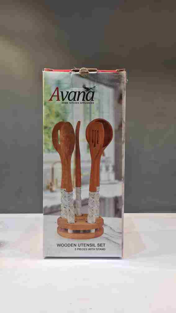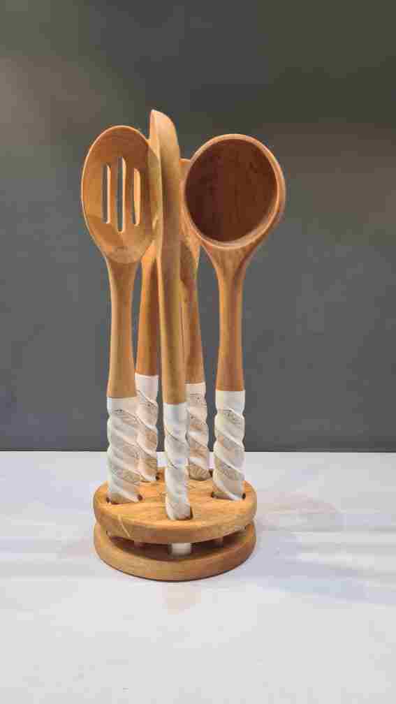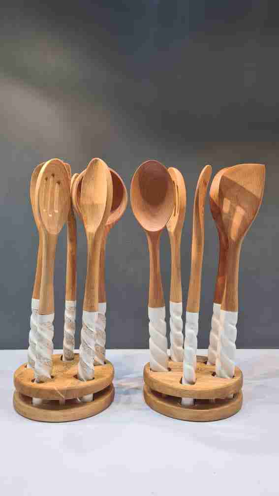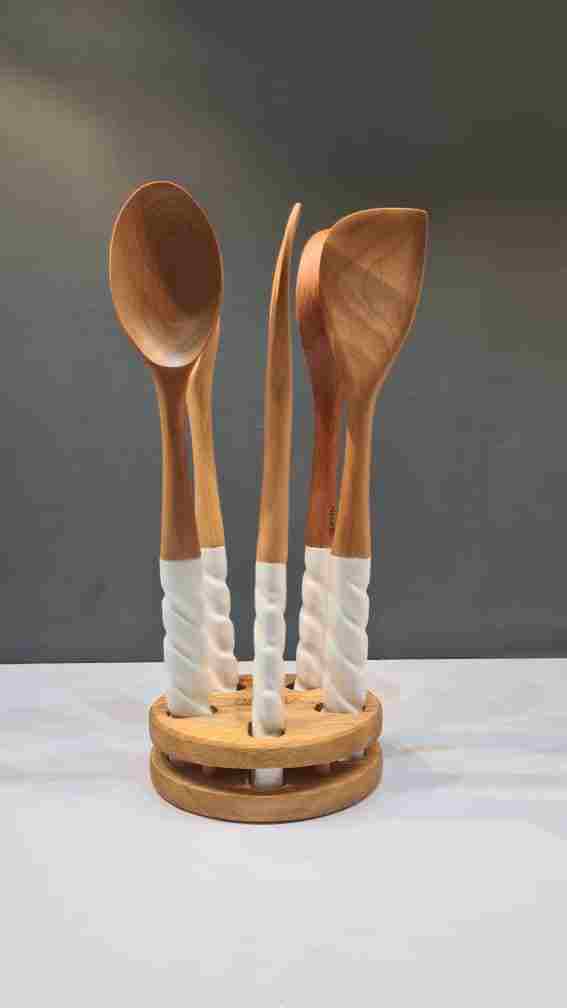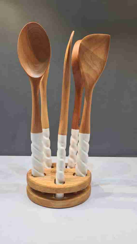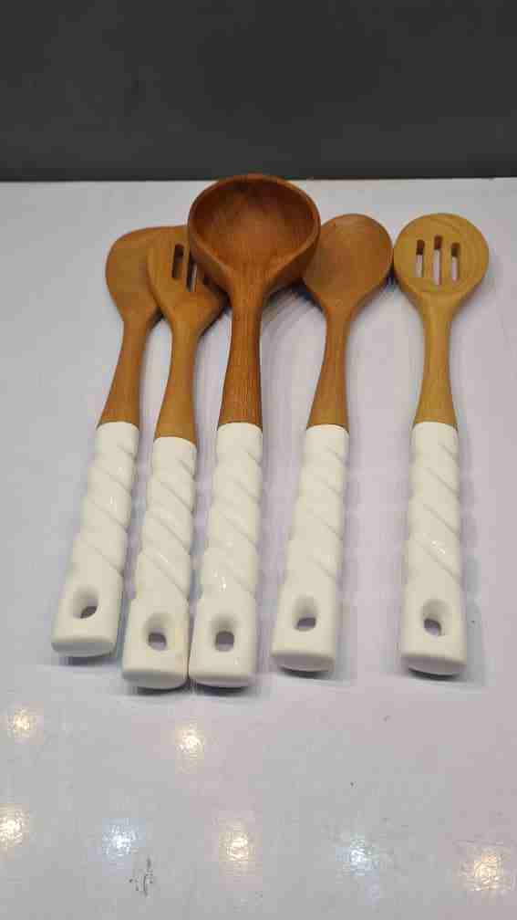 سرویس کفگیر و ملاقه چوبی با دسته ی چینی در دو رنگ سفید و طوسی